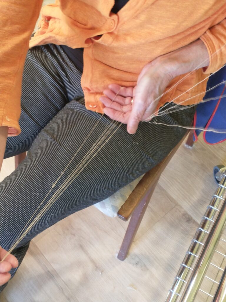 Using the small samples of sized and unsized 4-ply yarn that Karla initially provided, Bobbie warped up a mini-frame loom and then a table loom. It was quickly determined that the linen yarn would benefit from sizing (adding a smoothing/stiffening agent – in our case, a slurry of boiled cornstarch ).