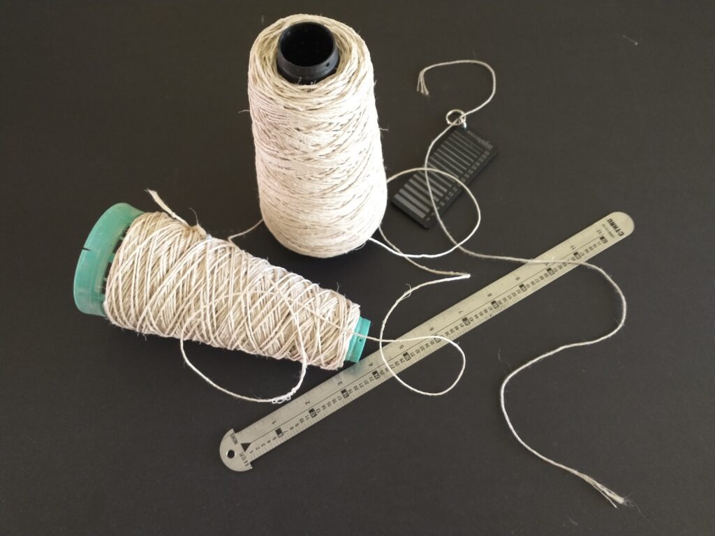 Karla here! When I off-handedly offered to make a rug warp for Bobbie, I didn’t truly comprehend the commitment I had made. To be sure, I thought it would be quick and easy: ply together some of my earlier home-grown, hand-spun linen yarn to make it stronger, thicker, smoother, and uniform. Lovely as it is, though, I soon discovered the yarn I had available was just not suitable for the project. For instance, I couldn’t ask Bobbie to use her beautiful handspun wool yarn and exquisite rug skills on a second-rate rug warp. Even though the yarn would be mostly concealed by the weft-faced weave, it would contribute invisible but important characteristics that could enhance the rug, or drag it down. I realized I’d have to custom spin the singles (i.e., the individual lengths that would twist together to create the final yarn). In the process, I learned way more about spinning my tow flax (short fibres) and plying it into a suitable warp. I had a sample of commercial warp yarn to set my goal post, and got down to spinning. 1600m and a few trials later, I was ready to hunker down and make the final yarn.