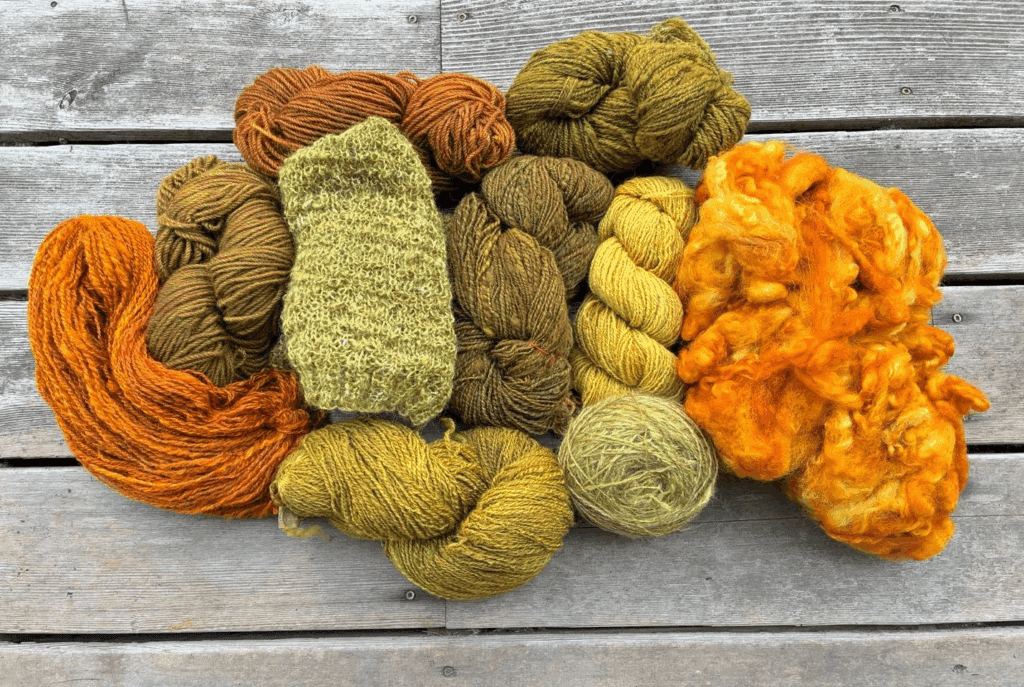 - Mordant with iron at about 5% WOF to get olive greens. You can add the iron with the alum mordant or make up a separate pot for the iron solution that you will dip the fibre into after it comes out of the initial dye pot, changing the yellow/gold to rich green.