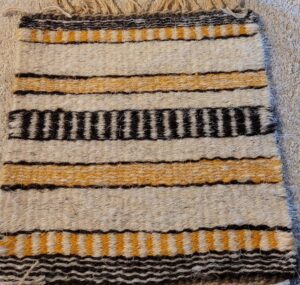 When it was completely bone dry, I carded it on my electric carder. The soiled ends required extra combing to remove the congealed matter. Carding into roving took several days which I alternated with spinning, not only to have a break but I was eager to see the resulting yarn. The roving spun nicely into yarn but it was uneven with a few ‘nepps’. This kind of thing I didn’t mind as I think it adds depth to the overall hand-made, artisanal look!