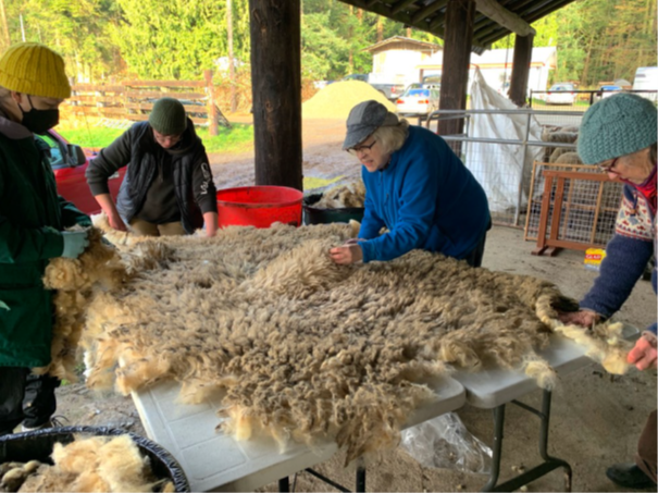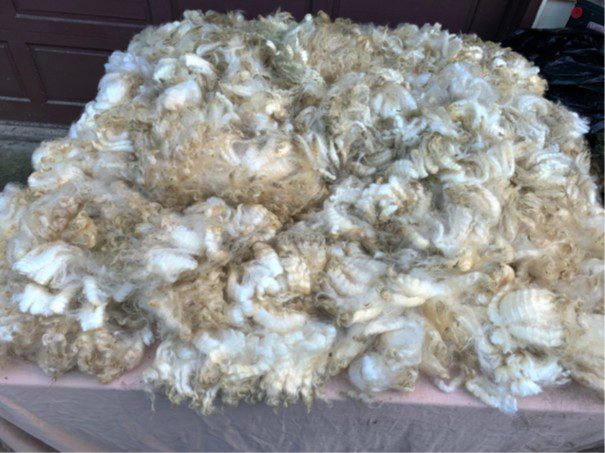 Last Spring, when I first saw this large fleece from Alexa at Somerset Farm, I was first taken with its lustre. But, as a spinner/knitter, I was then quickly impressed by the soft yet tough feel of the fibre. So I was excited to skirt it and get it into the wash. In hindsight, I was maybe too excited and in a rush and should have been more aggressive with the skirting process as there was a lot of vegetable matter that refused to wash out despite several washings with Platinum Dawn. With my husband’s help, I laid it out in the workshop to dry on wood-framed metal screens he uses for various gardening purposes. It took several days as we turned it over a few times and picked out straw, etc.
