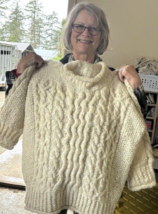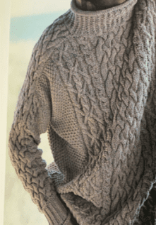 Fortunately, I decided to forego the complicated pattern on the sleeves (see picture, Kristin Nicholas 1995 pattern), as I felt the extra cables would add too much bulk to an already hefty sweater! It needed more balance and lightness in my opinion. I’m very happy with the result! It is both soft and tough and due to its toughness I feel it will last for years!