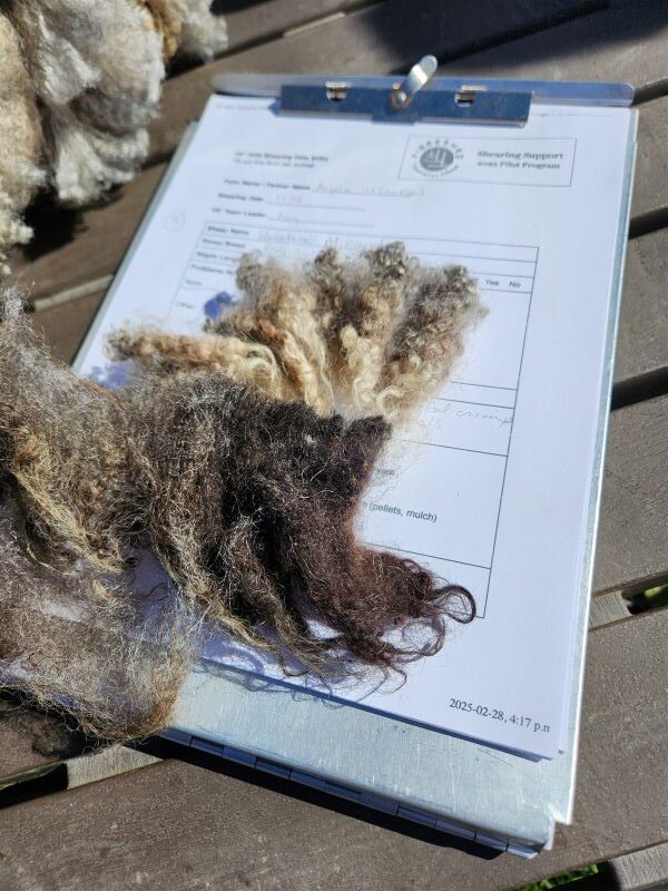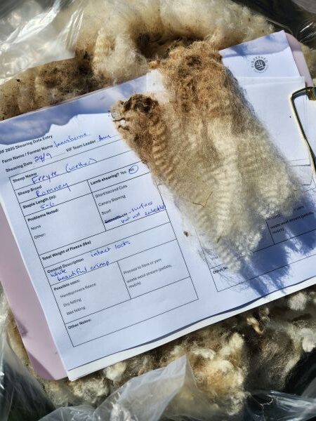 The team receives fleeces as the shearer finishes with each animal. We skirt the fleeces, removing the obviously dirty bits around the edges of the fleece. We pull out damaged or felted wool from the middle of the back and neck (some sheep really like to rub on fence posts!) and remove fleece that’s full of vegetation. We test for fleece strength with a ping test, estimate fleece length and crimp, and weigh the skirted fleece before bagging the fleece for storage/sale. We take notes on these characteristics, colour, and possible use, and often take photos of each fleece. These are provided to the farmer afterwards for their use in marketing their fleeces.