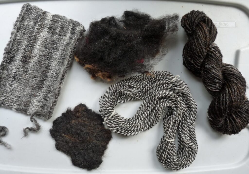 At the centre top of the photo is a handful of raw fleece from a sheep that has both black and white wool. To the right of it is a bulky singles that would be excellent in a rug or for an outdoor sweater. Going clock-wise, there is a finer two ply (one white, one black) that feels surprisingly soft – would make great socks or a vest. Next up is a small piece of fleece that I wet felted, just to see if such a sturdy fibre would actually felt. It did! The last sample is a carded blend of both white and black parts of the fleece, that I spun as a very soft, slubby single, then plied with a sewing thread. It knit up beautifully – would make a great sweater.