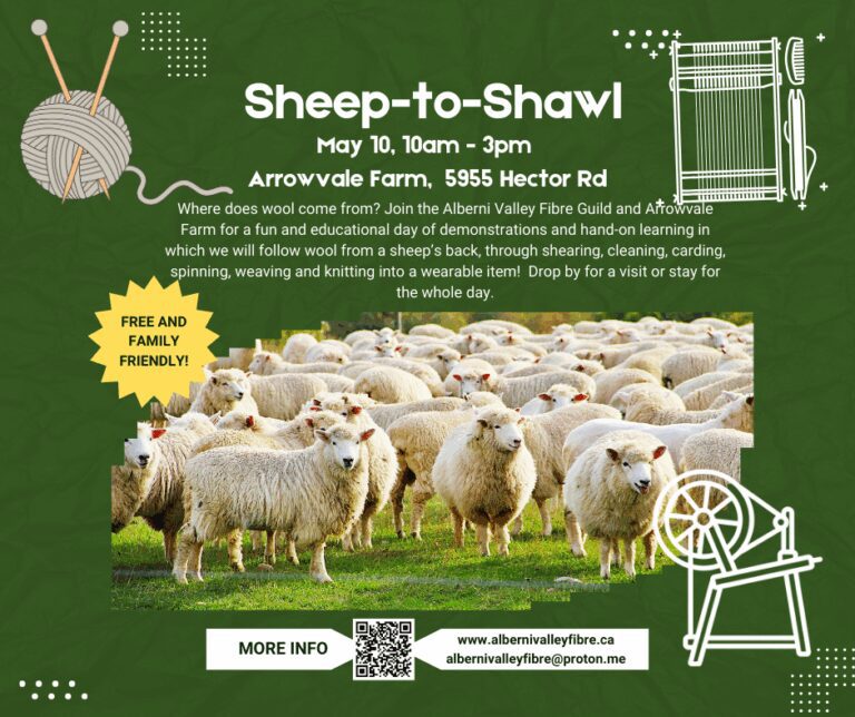 Sheep-to-Shawl May 10, 10am – 3pm Arrowvale Farm, 5955 Hector Rd, Port Alberni Where does wool come from? Join the Alberni Valley Fibre Guild and Arrowvale Farm for a fun and educational day of demonstrations and hand-on learning in which…