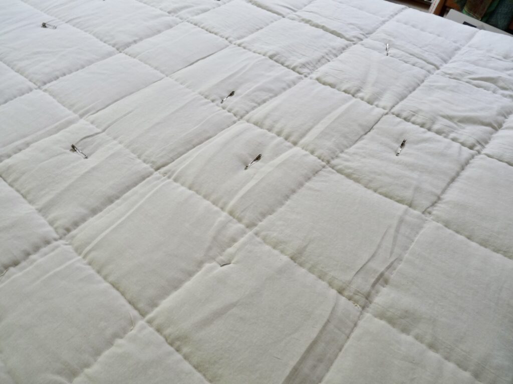 The roll of batting as it came from Custom was more than big enough for a double sized quilt. This time, I sandwiched it between two layers of finely woven organic cotton mull from Maiwa, all the better to hold those crimpy wool fibres from wiggling their way out. I then pinned, and began hand basting the layers together, which worked well but took an awful long time, especially because I could only work when the dining room table was clear, which almost never happens. Finally I decided to bast the layers using an extra long stitch on my sewing machine, and was done in a couple of hours.