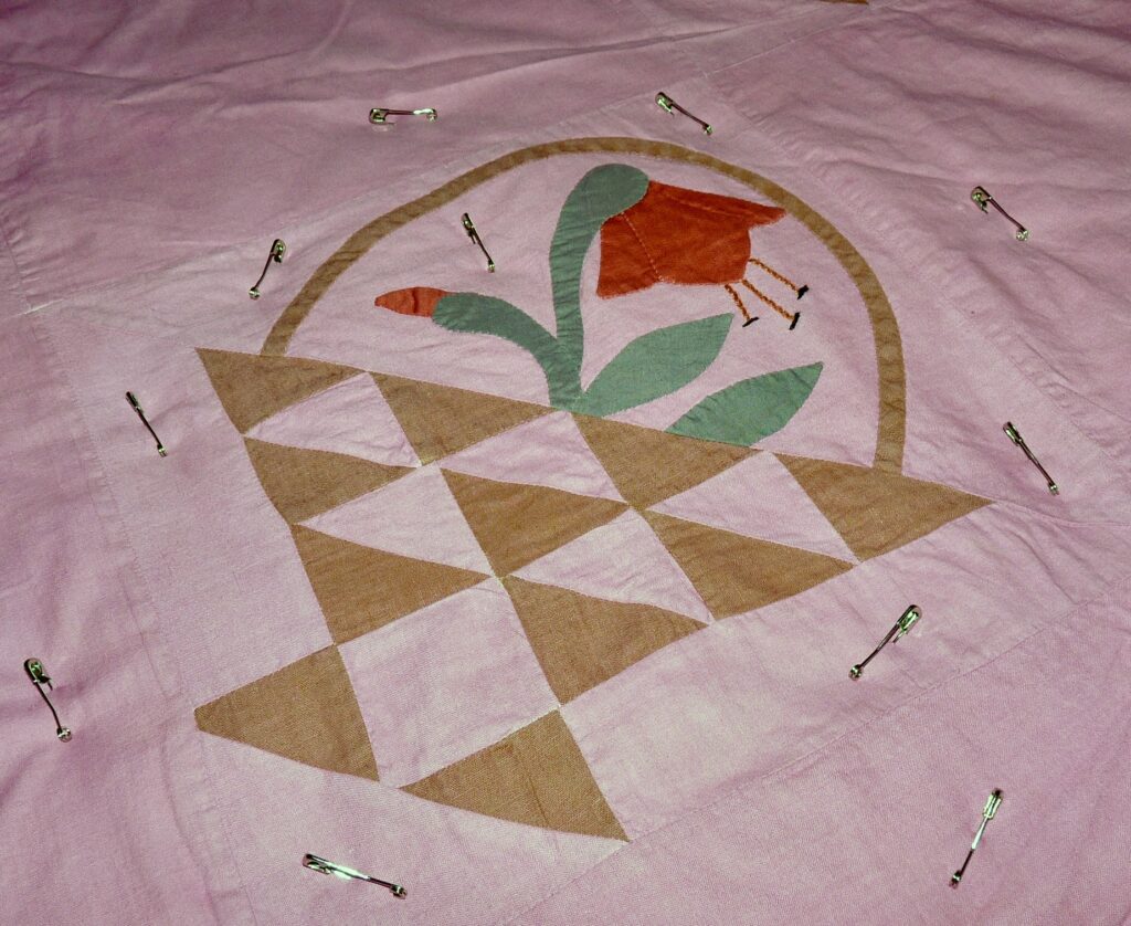 Now on to the fun part – the actual quilting. I am using a pieced cotton quilt top in the Grandmother’s Flower Basket pattern that I got at an island estate sale – the fabric is more closely woven than the poly-cotton blend I used for my first quilt. I will pin baste and machine quilt to hold it all together. Although I have used a traditional patchwork quilt top, there’s no reason why you couldn’t any other firmly woven light-to-medium weight fabric. Part of the appeal of a quilt is that they can be made with what’s on hand – sheets, vintage table cloths, yardage from the stash!